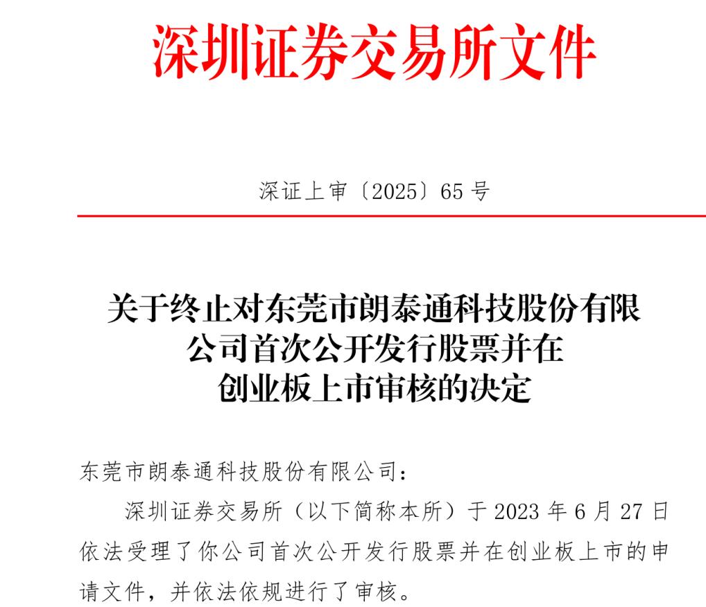 2025年5月19日,东莞市朗泰通科技股份有限公司(以下简称“朗泰通”)创业板IPO审核状态变更为“终止(撤回)”。