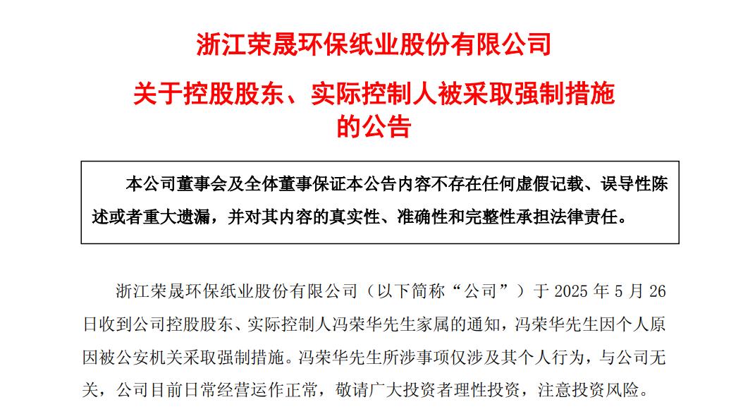 5月26日,浙江荣晟环保纸业股份有限公司(以下简称“荣晟环保”)发布公告称,该公司控股股东、实际控制人冯荣华因个人原因被公安机关采取强制措施。