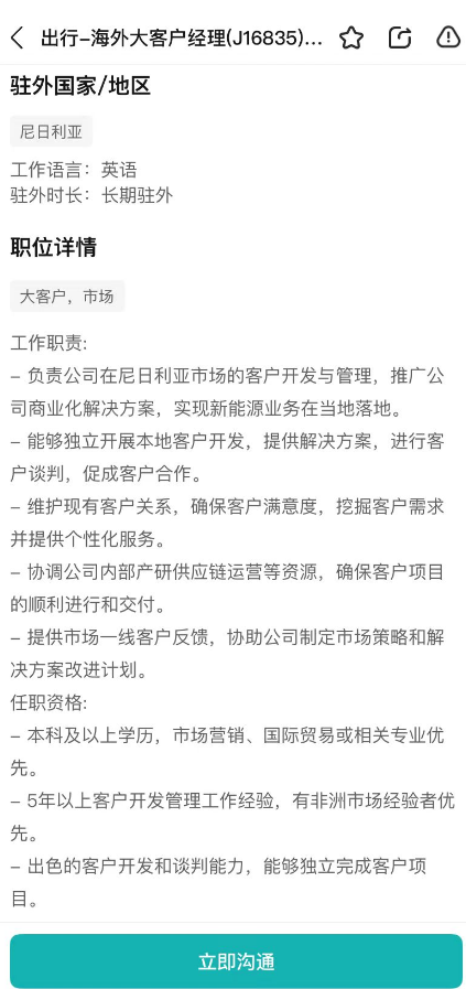 GPLP犀牛财经查询发现,传音控股目前正在招聘出行业务的相关岗位,以“海外大客户经理”为例,该职位要求长期驻外,负责该公司在尼日利亚市场的客户开发与管理,推广公司商业化解决方案,实现新能源业务在当地落地等。