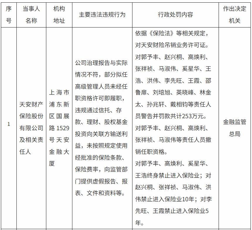 行政处罚信息显示,国家金融监管总局对天安财险吊销业务许可证;对郭予丰、赵兴桐、高焕利、张祥祯、马淑伟、奚星华、王浩、洪伟、李先旺、王霞、邵鲁扉、刘培旭、英晓峰、林金太、孙兆轩、戴相钧等责任人员警告并罚款共计253万元;对郭予丰、赵兴桐、高焕利、张祥祯、马淑伟等责任人员撤销任职资格;对郭予丰、高焕利、奚星华、王浩终身禁止进入保险业;对赵兴桐、张祥祯、马淑伟、洪伟禁止进入保险业10年;对李先旺、王霞禁止进入保险业5年。
