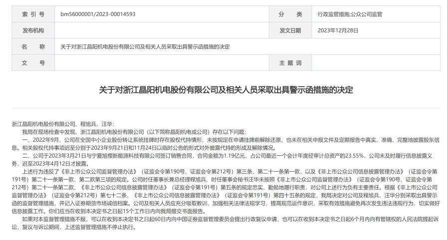 因上述行为违反了《非上市公众公司监督管理办法》相关规定,浙江证监局对晶阳机电及相关人员采取出具警示函的监督管理措施,并记入证券期货市场诚信档案。