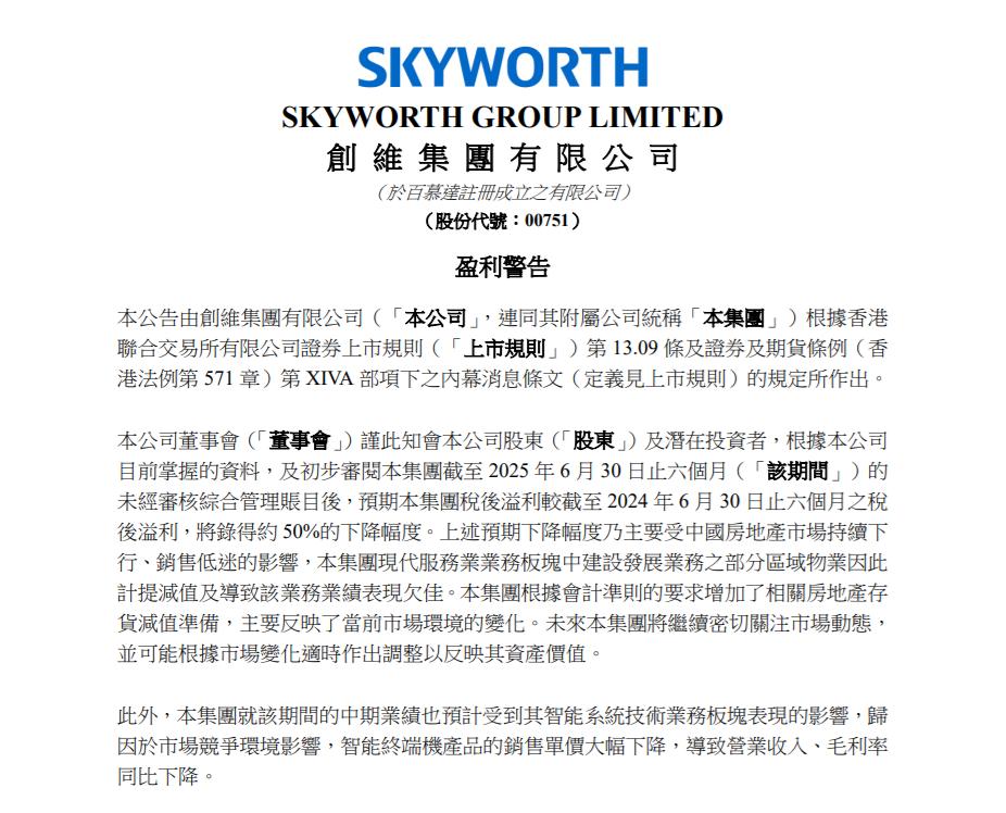 创维集团发布盈利警告,预计上半年净利润暴降50%