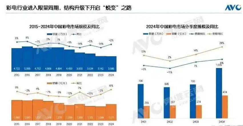 终端销量上,创维集团的主要产品集中在电视、冰箱、洗衣机等大家电领域。近年来,国内大家电市场整体增速放缓,甚至出现了阶段性的负增长。特别是电视市场,据奥维云网数据,2023年国内彩电市场零售量为3142万台,同比下降13.6%,2024年零售量3086万台,同比再降1.8%。