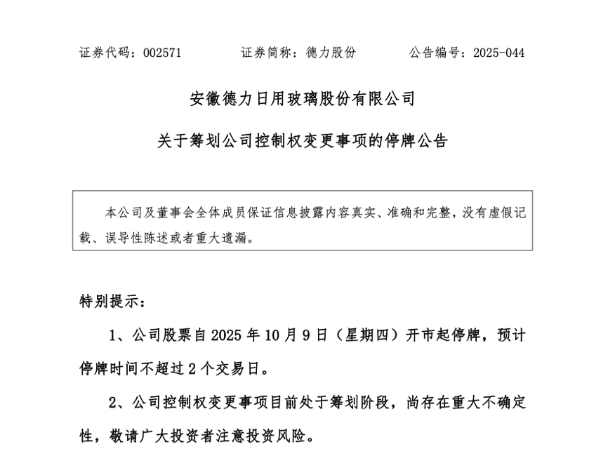 公告显示,德力股份股票自10月9日(星期四)开市起停牌,预计停牌时间不超过2个交易日。停牌期间,将按规定履行信息披露义务,待事项确定后发布公告并申请复牌。