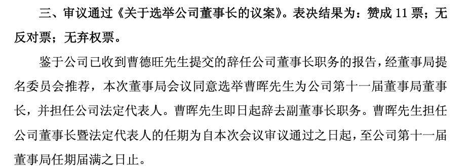 10月16日晚间,上交所上市公司福耀玻璃发布公告称,董事长曹德旺因推动福耀玻璃治理结构战略性优化与可持续发展的需要,辞去董事长职务,将继续担任福耀玻璃董事及部分子公司的董事、董事长和法定代表人职务。同时,福耀玻璃选举曹晖为新任董事长,并任命其为法定代表人及董事局战略发展委员会主任。
