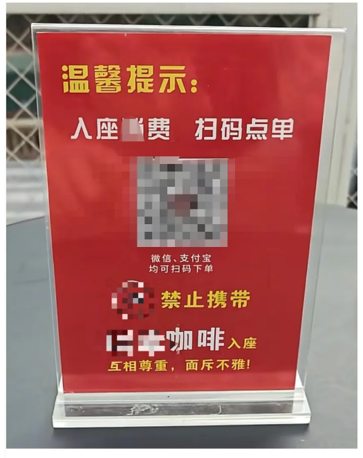 照片中,一块放置在门店外摆区桌上的提示牌写道:“入座消费,扫码点单,禁止携带某品牌咖啡入座,互相尊重,面斥不雅”。这一将矛头直指竞争对手、试图“谢绝非自家消费者”的举动,很快将库迪咖啡推至舆论中心。