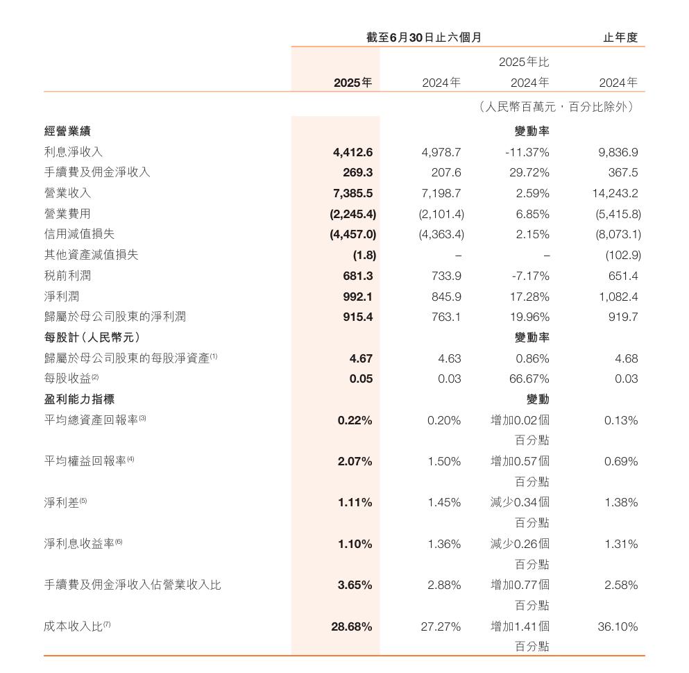 根据哈尔滨银行此前发布的2025年中期报告,该公司2025年上半年实现营业收入738.55亿元,较2024年同期的719.87亿元小幅增长2.59%。哈尔滨银行收入结构发生明显变化,作为传统主要收入来源的利息净收入为441.26亿元,同比下降了11.37%;手续费及佣金净收入达到26.93亿元,同比大幅增长29.72%,其占营业收入的比重也提升了0.77个百分点至3.65%。在支出方面,哈尔滨银行营业费用为224.54亿元,同比增长6.85%;信用减值损失为445.70亿元,同比增长2.15%。哈尔滨银行营业支出有所增加,实现净利润99.21亿元,同比增长17.28%;归属于母公司股东的净利润为91.54亿元,同比增长19.96%,盈利增长表现优于营收增长。
