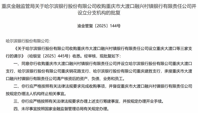 根据批复文件,此次涉及的两项收购均在同一日获得核准。第一项批复同意哈尔滨银行收购重庆市大渡口融兴村镇银行有限责任公司,并相应设立哈尔滨银行重庆大渡口支行、重庆钢花路支行、重庆建胜支行,共计三家支行。第二项批复则同意哈尔滨银行收购重庆市沙坪坝融兴村镇银行有限责任公司,并设立哈尔滨银行重庆凤天路支行、重庆回龙坝支行、重庆大学城支行,同样为三家支行。