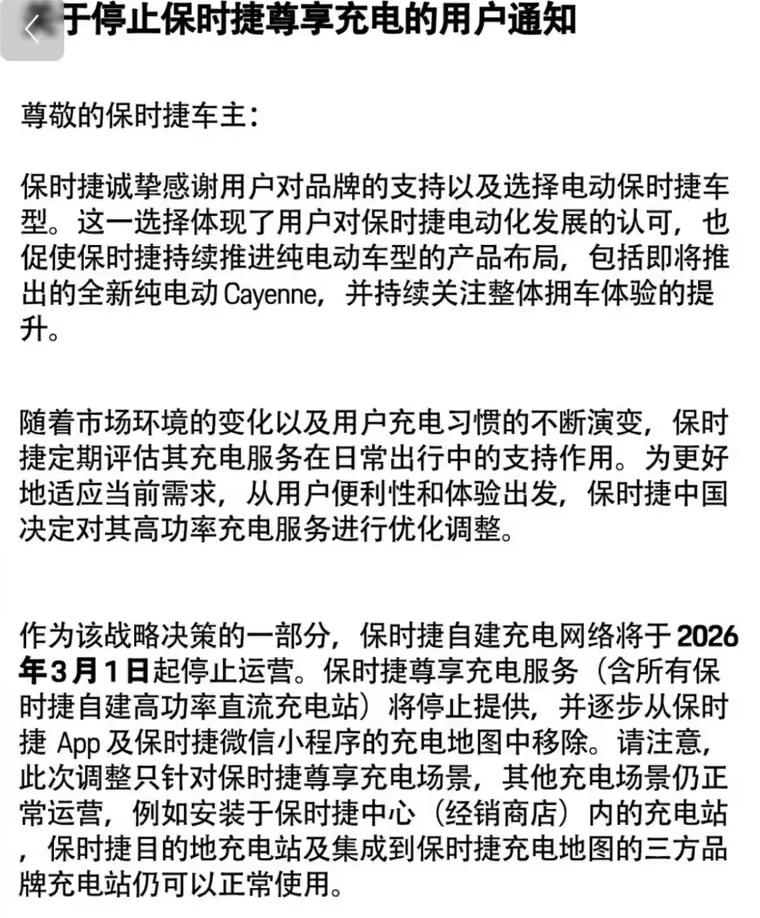 12月22日,据多家媒体报道,保时捷中国发布《关于停止保时捷尊享充电的用户通知》(下称“通知”)。保时捷中国确认,其所有自建充电网络将于2026年3月1日起逐步停止运营,总计约200家充电站。