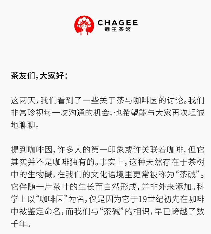 霸王茶姬12月26日又进一步发文科普茶叶和咖啡因的关系。天然茶叶中自带有茶多酚和茶碱(即咖啡因),霸王茶姬在文中称,以咖啡因为名,仅是因为19世纪初先在咖啡中被鉴定命名。