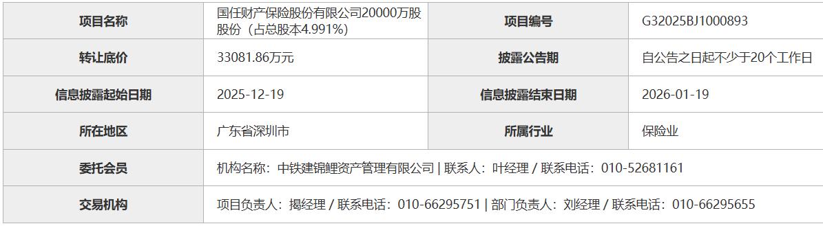 日前,国任财产保险股份有限公司(以下简称“国任财险”)2亿股股份,占总股本的4.991%,在北京产权交易所挂牌出让,转让底价约为3.31亿元,股权持有人为国任财险第五大股东中国铁建投资集团有限公司,这也是其持有的全部股权。