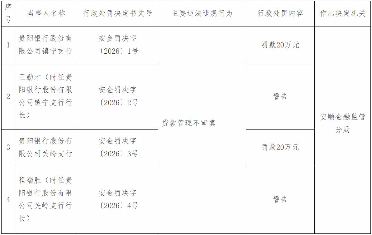 国家金融监督管理总局安顺监管分局披露的行政处罚信息公开表显示,贵阳银行镇宁支行、关岭支行因贷款管理不审慎,分别被罚款20万元。同时,时任贵阳银行镇宁支行行长王勤才、关岭支行行长程端胜均被警告。