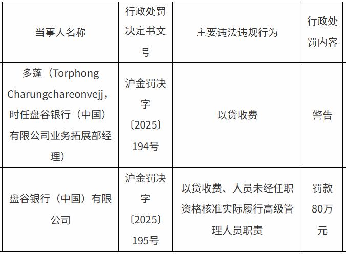 2026年1月7日,国家金融监督管理总局上海监管分局发布的行政处罚信息公开表显示,盘谷银行(中国)有限公司因存在以贷收费、人员未经任职资格核准实际履行高级管理人员职责等违法违规行为,被罚款80万元。同时,时任盘谷银行(中国)业务拓展部经理多蓬因以贷收费被警告。