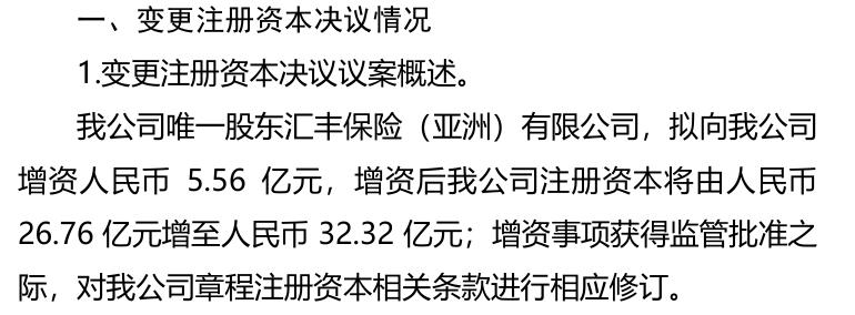 2026年1月8日,汇丰人寿发布公告称,汇丰保险(亚洲)有限公司拟增资5.56亿元,增资后汇丰人寿注册资本将由26.76亿元增至32.32亿元,无新增股东,增资后汇丰保险(亚洲)有限公司持有汇丰人寿100%股权比例维持不变。增资事项获得监管批准之际,对该公司章程注册资本相关条款进行相应修订。