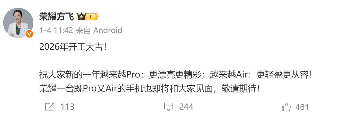 1月4日,荣耀产品线总裁方飞在微博平台发文称,“荣耀一台既Pro又Air的手机即将和大家见面”,随后引起业界关注和热议。