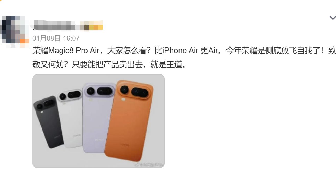 有网友表示“蚌埠住了,和iPhone Air有什么区别?”也有网友调侃“和谷歌Pixel完全一样”,甚至有网友称“比iPhone Air更Air,今年荣耀是彻底放飞自我了!致敬又何妨?卖出去就行,就是王道”。