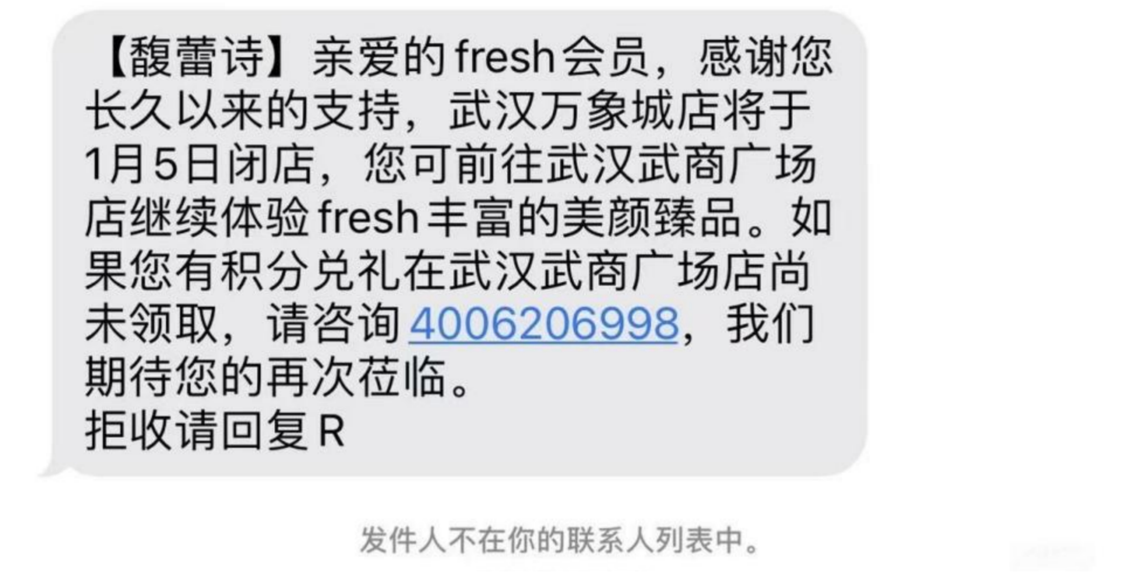 近日,fresh向会员发送短信通知,武汉万象城店于1月5日闭店,后续可前往武汉武商广场继续体验fresh产品以及进行积分兑礼等。这意味着,武汉万象城店闭店后,fresh在武汉核心商圈仅剩武商广场一家柜台。