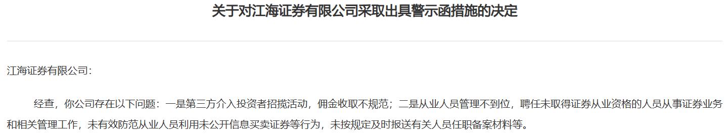 江海证券及旗下营业部被出具警示函 佣金收取不规范