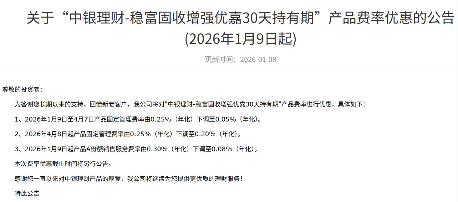 1月8日,中银理财发布多款产品费率调整公告。其中,中银理财-稳富固收增强优嘉30天持有期自1月9日起将固定管理费率由0.25%下调至0.05%,并于4月8日回调至0.2%;具体优惠截止时间将另行公告。