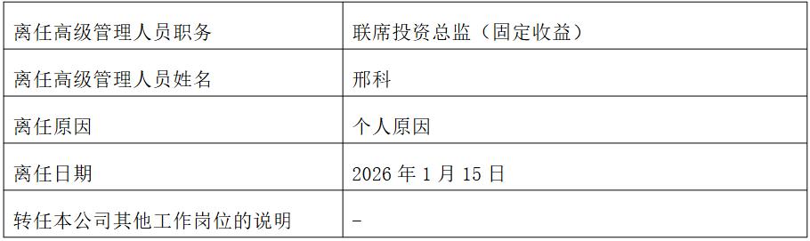 1月15日,中银基金发布公告称,联席投资总监(固定收益)邢科因个人原因离任。