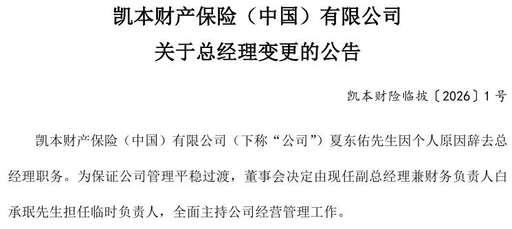 日前,凯本财产保险(中国)有限公司(以下简称“凯本财险”)发布公告称,夏东佑因个人原因辞去总经理职务。为保证凯本财险管理平稳过渡,董事会决定由现任副总经理兼财务负责人白承珉担任临时负责人,全面主持凯本财险经营管理工作。