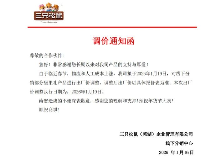 近日,一份网传的“三只松鼠调价通知函”显示,三只松鼠拟于2026年1月19日,对线下分销部分坚果礼产品进行出厂价调整,调整后出厂价以具体报价表为准。三只松鼠给出的调价原因是“临近春节,物流和人工成本上涨”。