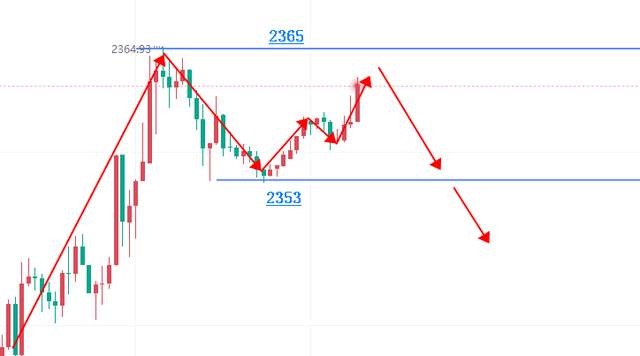 而就目前盘面价格走势来讲,持续的高位震荡,昨日高点依旧没有被刷新,多头还是没有表现出延续性,长时间的高位横盘反而会削弱多头上攻的动能,对多头并不利,四小时收出的长长上影线,与前面两次拉升后的形态如出一辙,一日强并不能定义为强。所以本交易日我们并不会一昧的盲目看涨,反而是围绕2365压制看回落,下方关注2353的下破情况,跌破2353就基本宣告上升完结,继续走大区间迂回,看跌即可。当然若2365不能压制价格回落,反而上破2365,届时再做调仓跟多即可。