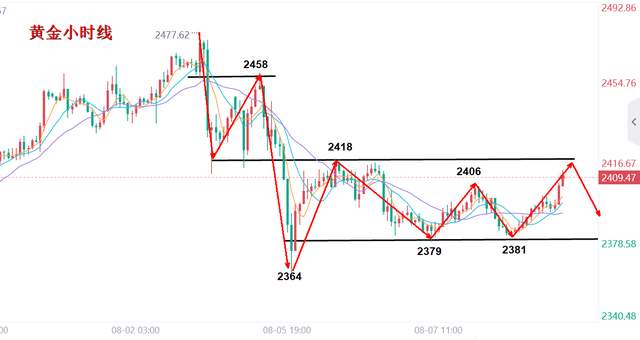 综上所述,不管是近期经济参数的冷清,还是降息市场反应的平淡,金价在近几个交易日一直处于胶着的状态, 周一下跌后金价反弹高点在2418一线,昨日反抽最高2406一线没有继续上行测试,今日探底回升,欧盘延续了早间的反弹,那么就还有测试上方反抽的高点,目前形态依然在区间内运行,所以晚间看双顶将继续遇阻回撤,上方阻力2418附近,下方支撑2393,2385.
