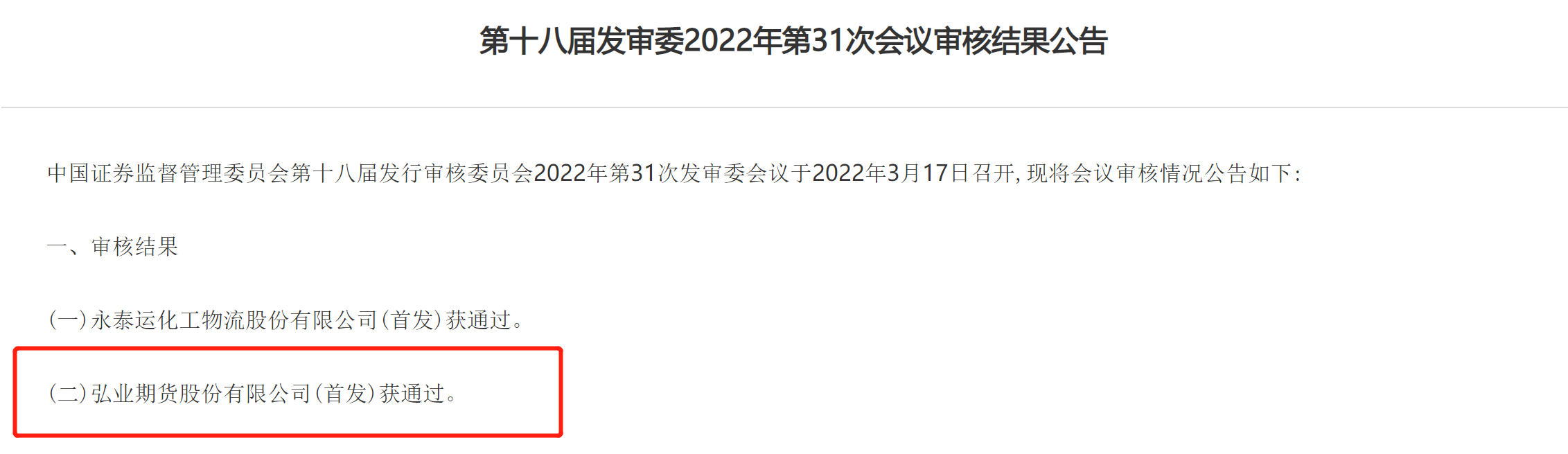 3月18日,资本邦了解到,首家A+H两地上市期货公司或将于年内诞生。昨日,证监会公布第十八届发审委2022年第31次会议审核结果公告,弘业期货顺利过会。