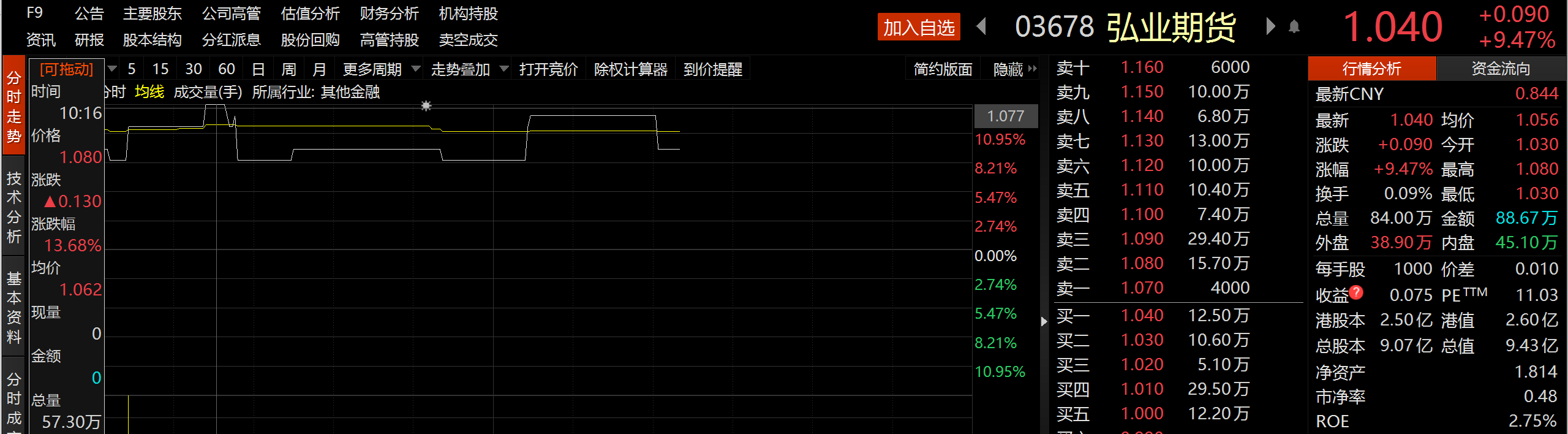 受利好消息刺激,今日开盘,弘业期货港股开盘爆拉,盘中一度涨超13%。截至今日午时发稿,弘业期货报1.04港元/股,较昨日涨9.5%。