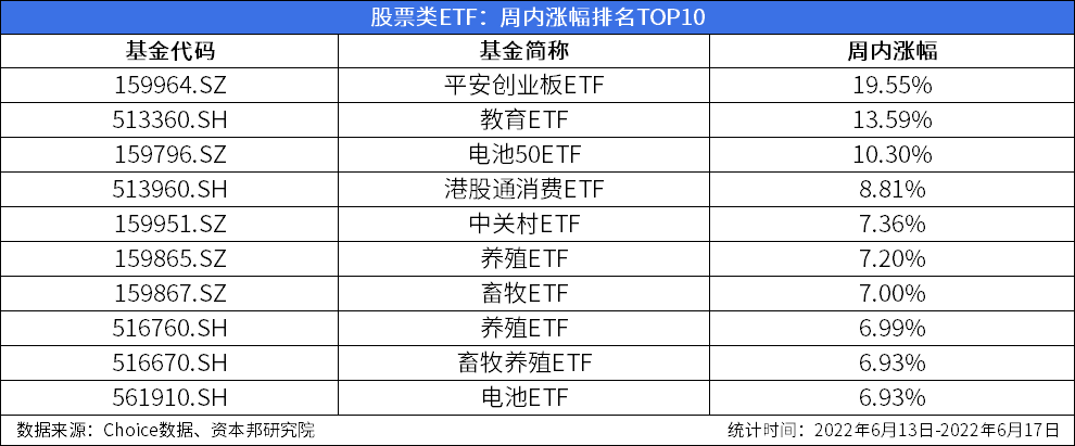 具体来看,股票类场内ETF周内涨幅榜TOP10中,3只上涨幅度超10%。平安基金、博时基金、汇添富基金旗下的平安创业板ETF(159964)、教育ETF(513360)、电池50ETF(159796)周内上涨幅度分别为19.55%、13.59%、10.30%,位居榜单前三名。