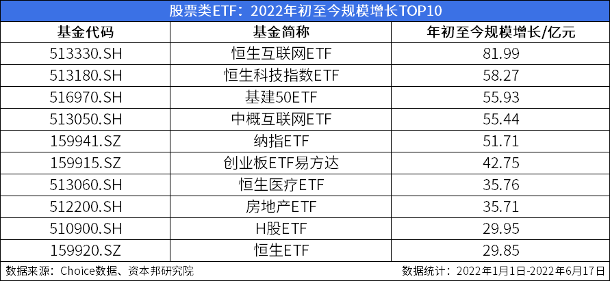 2022年初至今规模增长TOP10榜单中,华夏基金旗下的恒生互联网ETF(513330)、恒生科技指数ETF(513180)年初至今规模分别增长81.99亿元、58.27亿元,位居增长榜单前二。基建50ETF(516970)、中概互联网ETF(513050)、纳指ETF(159941)年初至今规模分别增长了55.93亿元、55.44亿元、51.71亿元。
