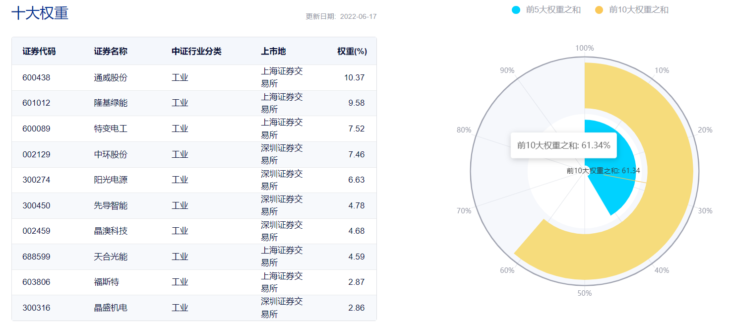中证指数公司数据显示,截至2022年6月17日,光伏产业指数前十大权重股分别是通威股份、隆基绿能、特变电工、中环股份、阳光电源、先导智能、晶澳科技、天合光能、福斯特、晶盛机电,前十大权重股占比61.34%,指数成分股行业分布主要集中在半导体、电气部件与设备、电子元件等。
