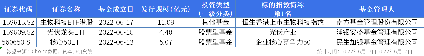 本周新“诞生”3只ETF,分别为生物科技ETF港股(159615)、光伏龙头ETF(159609)、核心50ETF(560650),发行规模分别为11.09亿元、4.4亿元和5.07亿元,合计20.56亿元。