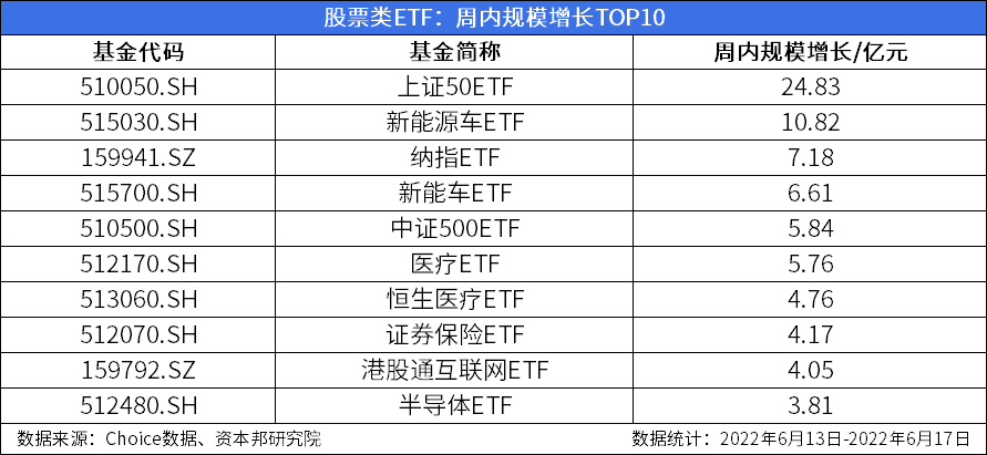 具体来看,上证50ETF(510050)、新能源车ETF(515030)周内规模增长均超10亿元,分别新增24.83亿元、10.82亿元,位居第一、二名。