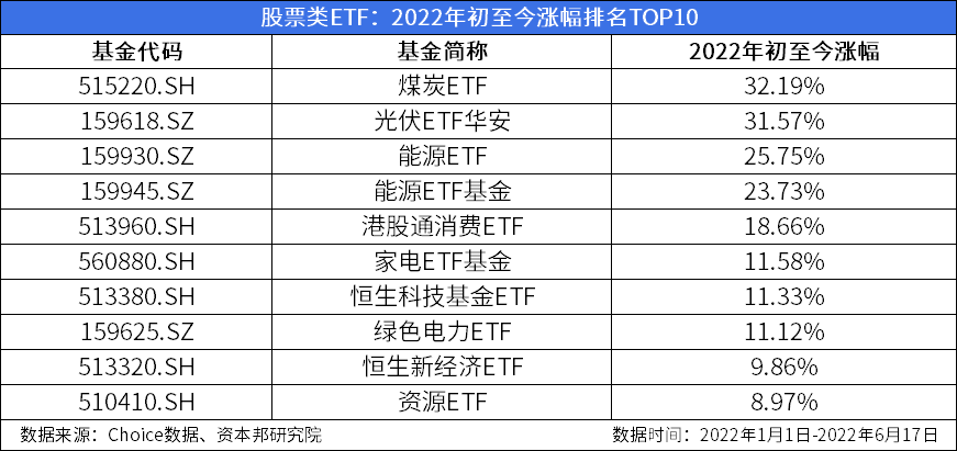 年内涨幅方面,截至本周五,2022年初至今合计630只股票类场内ETF中,42只ETF涨幅为正。从上涨幅度来看,超30%的ETF合计2只、20%-30%的ETF合计2只、10%-20%的ETF合计4只、8%-10%的ETF合计2只。