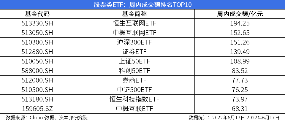 具体来看,恒生互联网ETF(513330)、中概互联网ETF(513050)、沪深300ETF(510300)、证券ETF(512880)、上证50ETF(510050)周内分别累计成交194.25亿元、152.65亿元、151.26亿元、139.49亿元、108.99亿元,位居成交榜前五位。