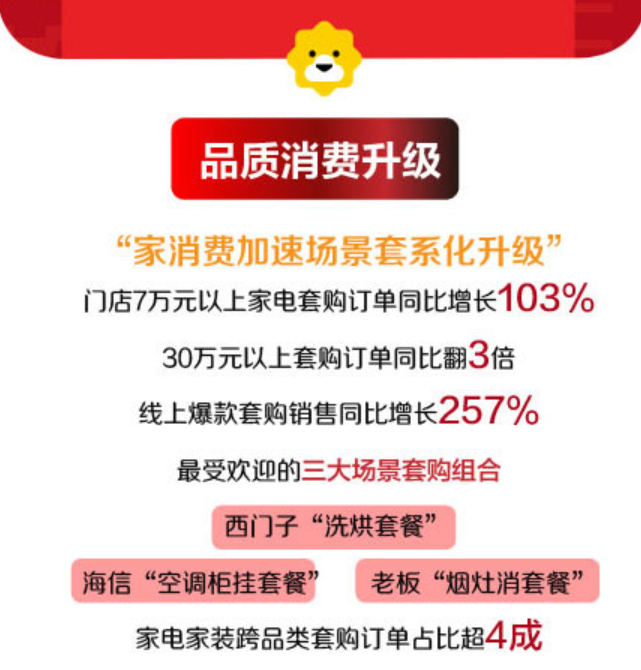据苏宁易购发布的《618家场景消费大数据》显示,今年618大促,苏宁易购门店7万元以上家电套购订单同比增长103%,30万元以上套购订单同比翻3倍,爆款套购销售同比增长257%。其中,西门子“洗烘套餐”、海信“空调柜挂套餐”、老板“烟灶消套餐”成为618最受欢迎的三大场景套购组合。随着商品供应链融合深化,苏宁易购平台家电家装“跨界式套购”成为消费新方式,订单占比超4成。
