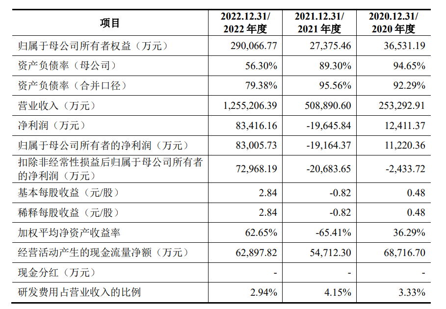 报告期内,公司营业收入规模持续增长,各期分别实现收入253,292.91万元、508,890.60万元和1,255,206.39万元,营业收入复合增长率达到122.61%,归属于母公司股东的净利润由2020年的11,220.36万元增长至2022年的83,005.73万元。
