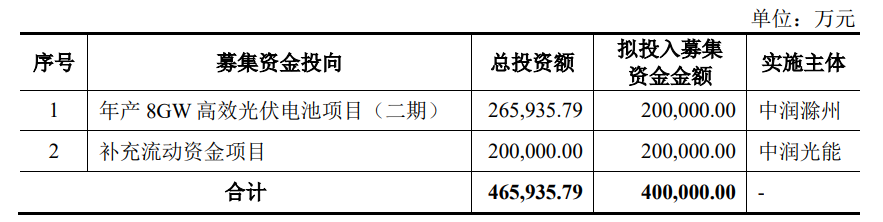 中润光能本次拟募集不超过4,001万股,募集资金为40亿元,本次发行的募集资金扣除发行费用后,具体投入以下项目:年产8GW高效光伏电池项目(二期)和补充流动资金项目。