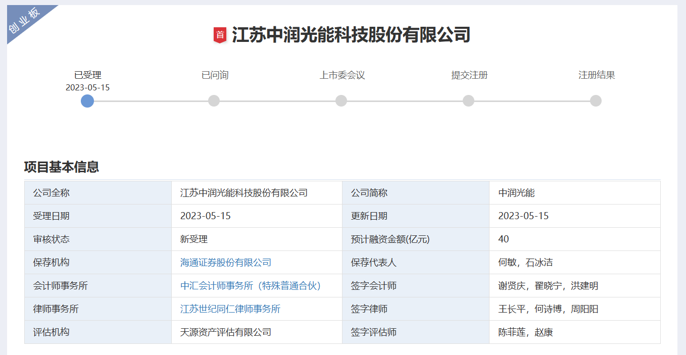 深交所官网消息显示,2023年5月15日,中润光能科技股份有限公司(简称“中润光能”)创业板IPO获受理,此次发行上市保荐机构是海通证券股份有限公司。