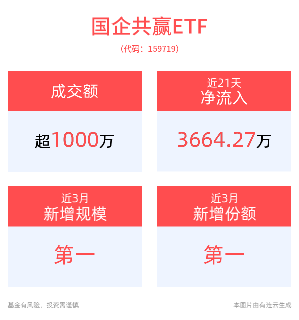 规模方面,国企共赢ETF近3月规模增长1.31亿元,实现显著增长,新增规模位居可比基金1/3。份额方面,国企共赢ETF近3月份额增长7600.00万份,实现显著增长,新增份额位居可比基金1/3。资金流入方面,国企共赢ETF近21个交易日内,合计“吸金”3664.27万元。