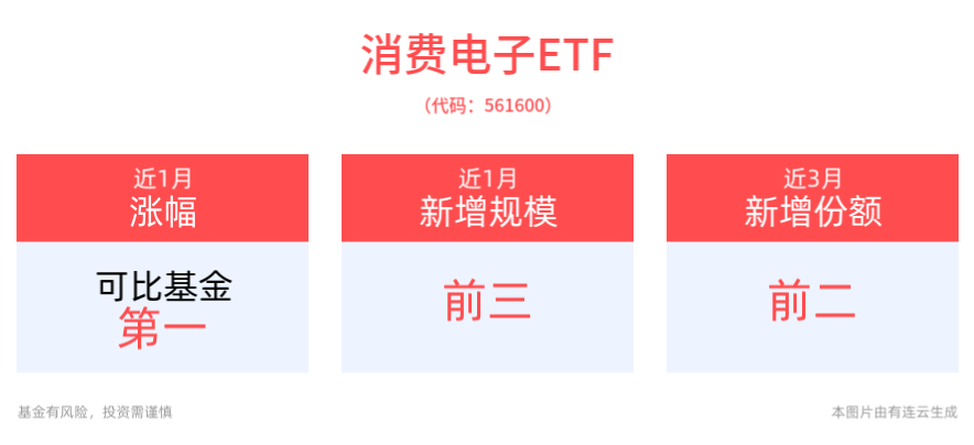 份额方面,消费电子ETF近3月份额增长1700.00万份,实现显著增长,新增份额位居可比基金2/7。