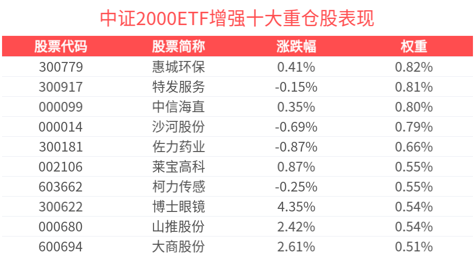 数据显示,截至2025年1月27日,中证2000指数(932000)前十大权重股分别为赢时胜(300377)、巨轮智能(002031)、润欣科技(300493)、北特科技(603009)、博创科技(300548)、力源信息(300184)、华胜天成(600410)、豆神教育(300010)、东方精工(002611)、拓斯达(300607),前十大权重股合计占比2.2%。