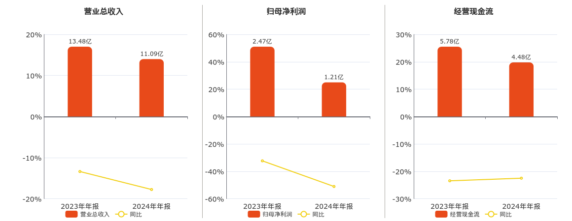 公司营业总收入为11.09亿元,较去年同报告期营业总收入减少2.39亿元,同比较去年同期下降17.76%。归母净利润为1.21亿元,较去年同报告期归母净利润减少1.26亿元,同比较去年同期下降51.07%。经营活动现金净流入为4.48亿元,较去年同报告期经营活动现金净流入减少1.30亿元,同比较去年同期下降22.50%。