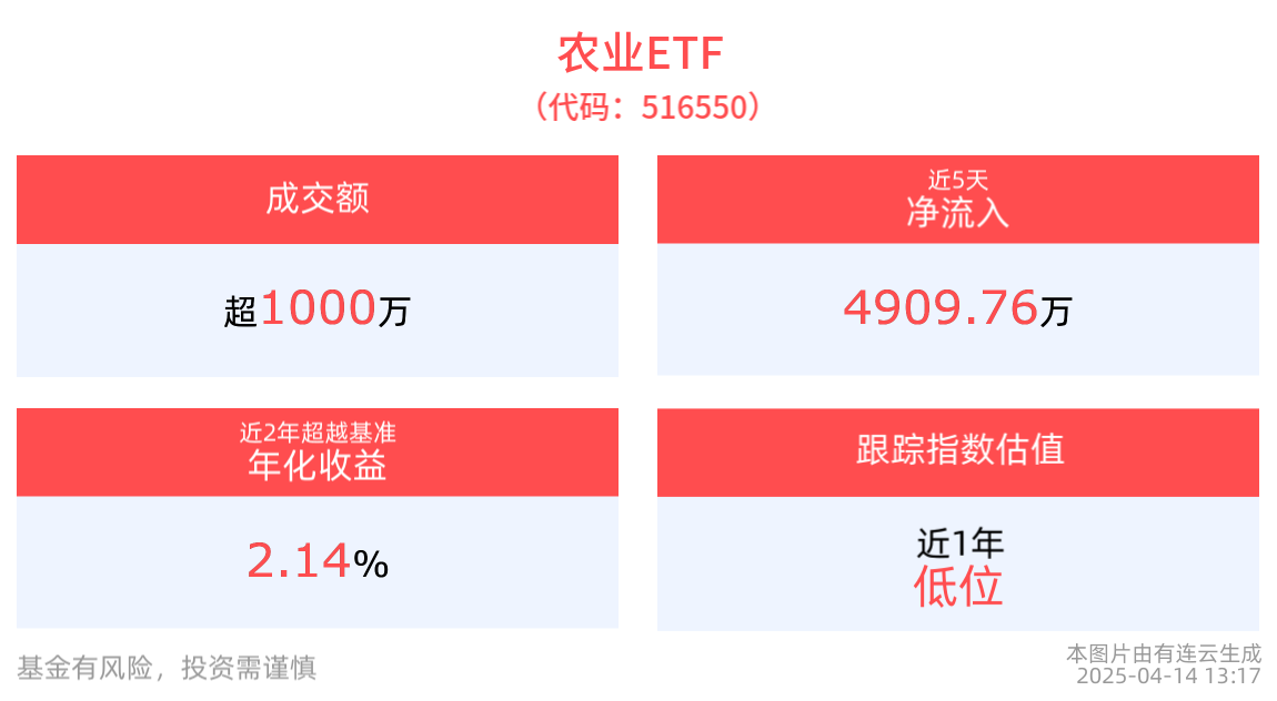 流动性方面,农业ETF盘中换手4.49%,成交1179.16万元。资金流入方面,拉长时间看,农业ETF近5个交易日内有3日资金净流入,合计“吸金”4909.76万元。