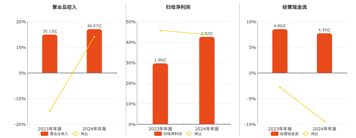 公司营业总收入为40.07亿元。归母净利润为2.82亿元。经营活动现金净流入为4.35亿元,较去年同报告期经营活动现金净流入减少4539.34万元,同比较去年同期下降9.45%。