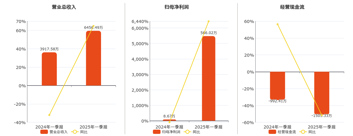 公司营业总收入为6456.49万元。归母净利润为566.02万元。经营活动现金净流入为-1505.33万元,较去年同报告期经营活动现金净流入减少512.92万元。