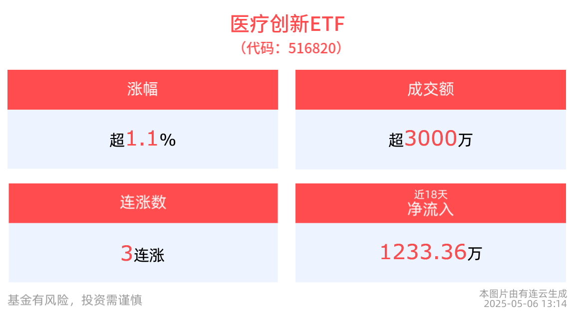 医疗创新ETF(516820)上涨1.19%, 冲击3连涨。最新价报0.34元。拉长时间看,截至2025年4月30日,医疗创新ETF近2周累计上涨0.60%。