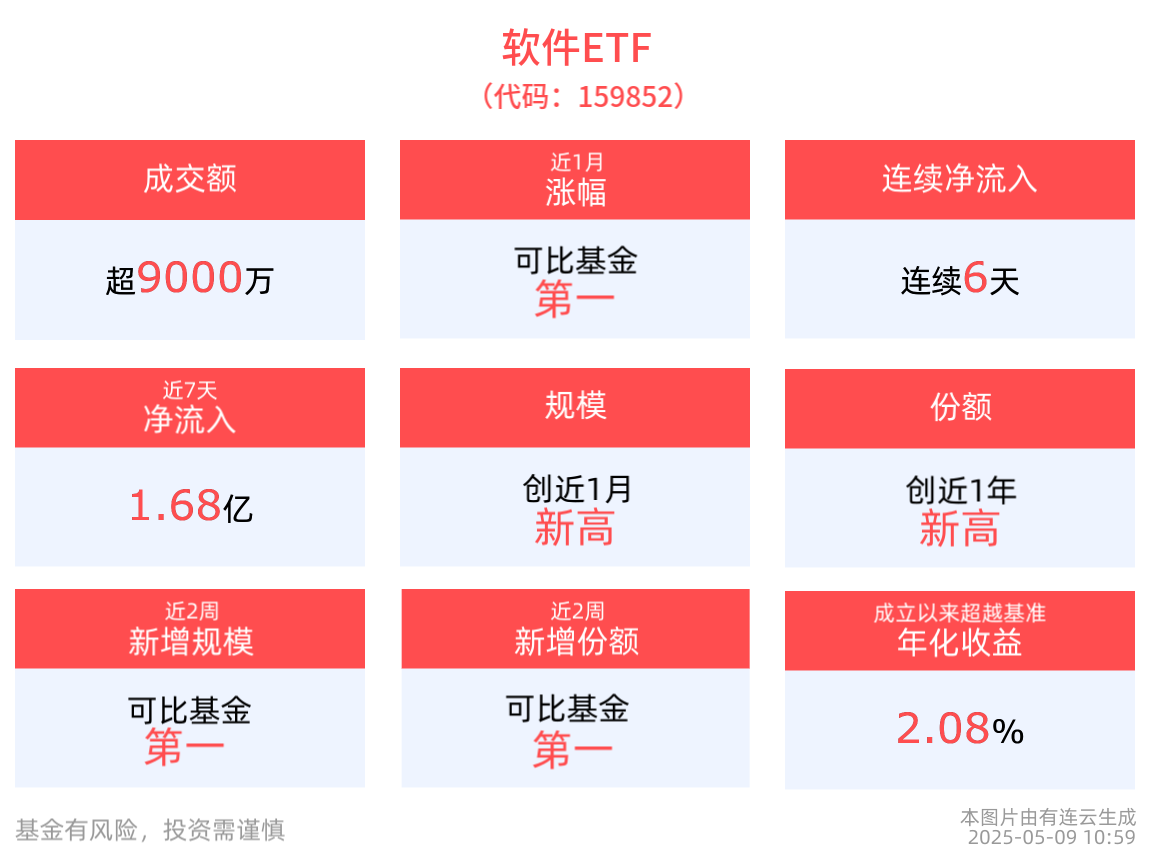 流动性方面,软件ETF盘中换手3.08%,成交9709.09万元。拉长时间看,截至5月8日,软件ETF近1周日均成交2.50亿元,居可比基金第一。